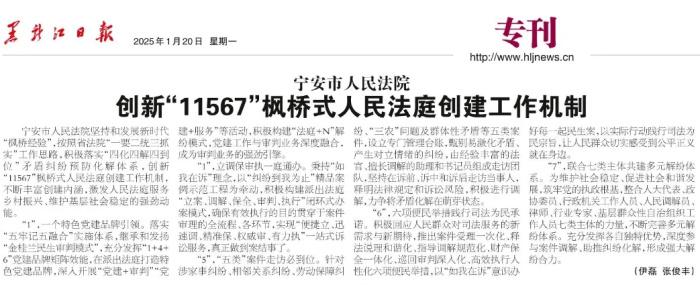 1月20日,《黑龙江日报》专题刊发了《宁安市人民法院创新“11567”枫桥式人民法庭创建工作机制》先进经验做法。