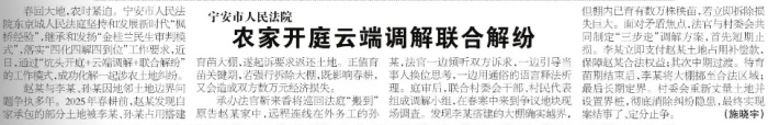 2025年4月30日,《黑龙江日报》专题刊发了《宁安市人民法院农家开庭云端调解联合解纷》。