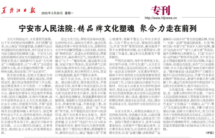 2025年5月26日,《黑龙江日报》专题刊发了《宁安市人民法院:铸品牌文化塑魂 聚合力走在前列》。