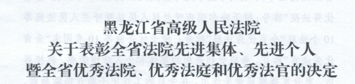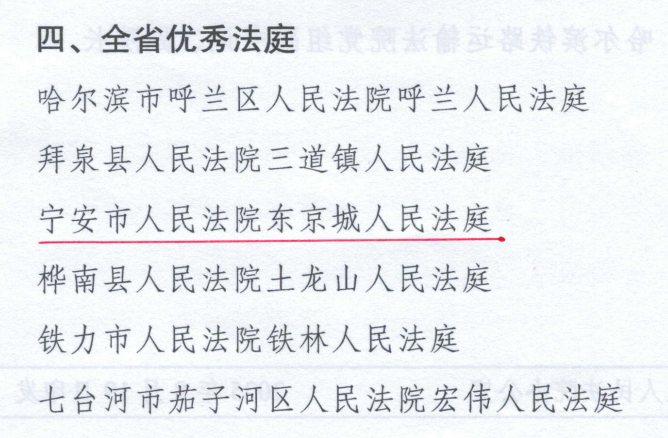近日,黑龙江省高级人民法院下发《关于表彰全省法院先进集体、先进个人暨全省优秀法院、优秀法庭和优秀法官的决定》,宁安市人民法院东京城人民法庭荣获“全省优秀法庭“称号。