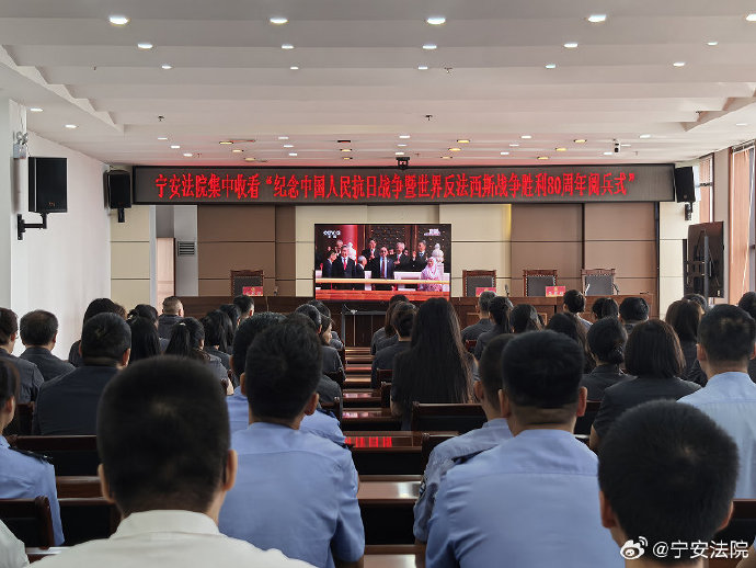 2025年9月3日,纪念中国人民抗日战争暨世界反法西斯战争胜利80周年阅兵式隆重举行。当天上午,宁安法院精心组织全体干警齐聚会议室,以庄重的姿态共同见证这一振奋人心的历史时刻。