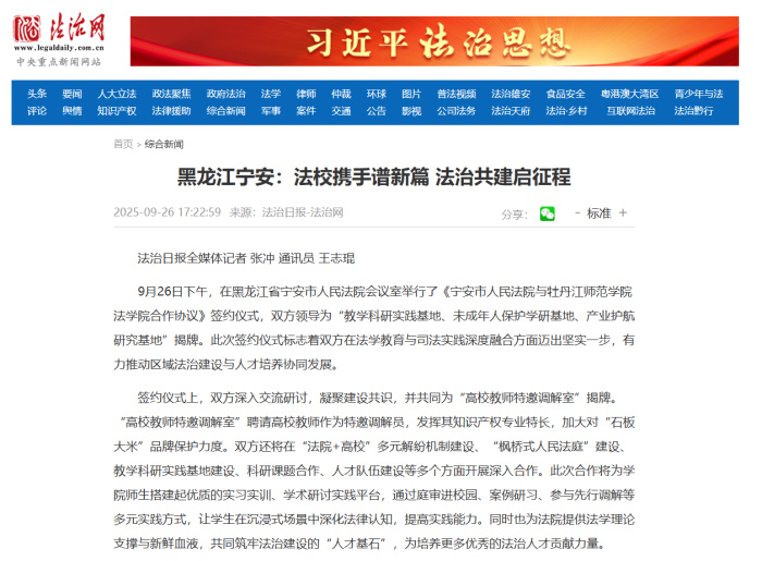 2025年9月26日,《法治网》刊发了《黑龙江宁安:法校携手谱新篇 法治共建启征程》,对宁安法院与牡丹江师范学院法学院战略合作签约仪式暨系列共建活动进行了专题报道。