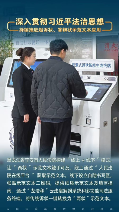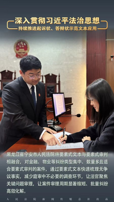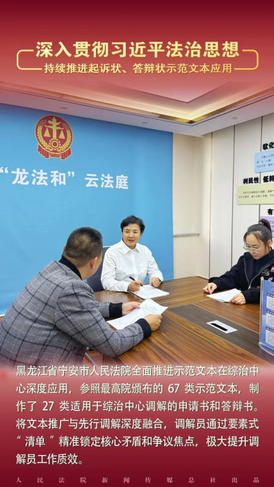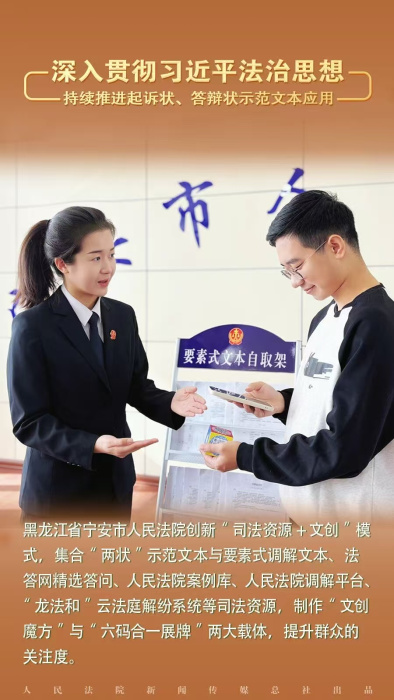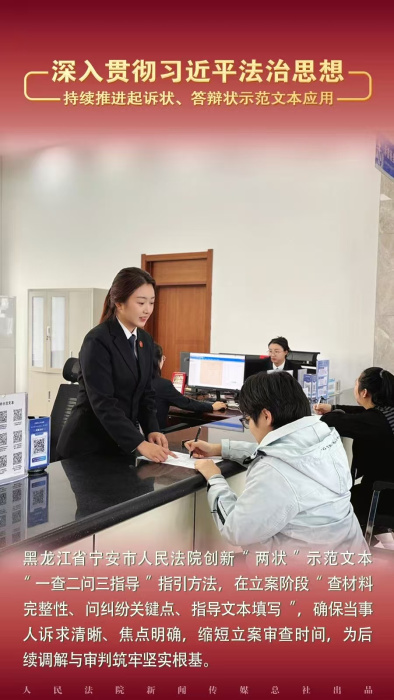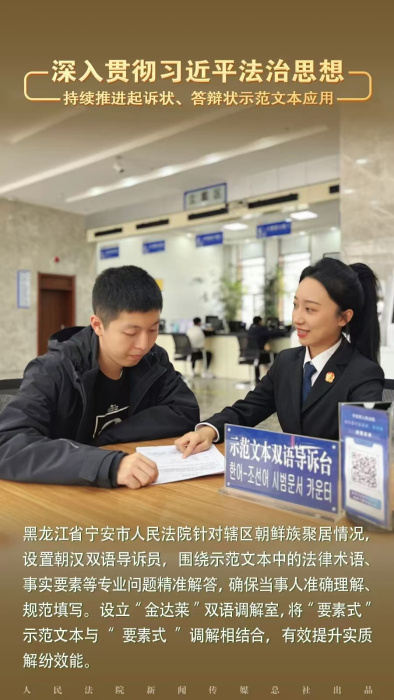 牡丹江畔,塞北宁安,这是一片多民族共融的土地。立足这一特点,黑龙江省宁安市人民法院在推广“两状”示范文本过程中,创新“一查二问三指导”工作法,设置朝汉双语导诉与双语调解,让司法服务更精准、更贴心。示范文本与先行调解深度融合,显著提升调解质效;要素式文本与审判有序衔接,助力法官聚焦关键,提高审判效率。通过“两状”示范文本的全面应用,宁安法院正持续激活基层治理新效能。
