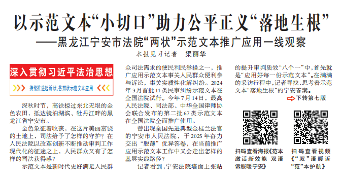 2025年11月3日,《人民法院报》头版刊发了《以示范文本“小切口”助力公平正义“落地生根”——黑龙江宁安市法院“两状”示范文本推广应用一线观察》,对宁安市人民法院“两状”示范文本推广应用典型经验进行专题报道。为贯彻落实最高人民法院关于加强诉讼文书标准化建设的改革部署,深化司法为民理念,宁安市人民法院坚持“一要二统三抓实”工作思路,贯彻落实“四化四解四到位”矛盾纠纷预防化解体系,将“两状”示范文本推广纳入年度重点工作,确立“一把手”总责、分管领导主抓、立案庭牵头、业务部门协同的工作体系,形成“人人重视、人人参与”的全院联动氛围。宁安法院将推广工作与“金桂兰示范岗”创建深度融合,通过“一查二问三指导”工作法、设立双语导诉和双语调解、开通绿色通道,确保司法服务精准覆盖,推动“两状”示范文本在基层治理中落地见效。依托“龙法和”云法庭解纷系统的示范文本自动生成、转化功能,为当事人提供传统起诉状转写为示范文本的服务,减少当事人修改成本。推动要素式文本与要素式调解相结合,针对辖区多发纠纷类型,参照最高院发布的67类示范文本,首创制作适用于综治中心调解的27类申请书和答辩意见书。在综治中心、诉讼服务中心醒目位置、接待窗口等摆放“六码合一”展牌,并制作“六码合一”魔方等文创产品,扫一扫就可以登录“人民法院案例库”手机端、“人民法院调解平台”“龙法和”云法庭解纷系统、浏览法答网精选答问、下载“两状”示范文本和要素式调解文本,全面推进“一网两库两平台两文本”在综治中心的深度应用。宁安法院运用多元化使用渠道与创新推广模式,全面推进“要素式”起诉状、答辩状示范文本推广应用,与牡丹江师范学院法学院签订合作协议,共建实践教学基地,将“人民法院案例库、多元解纷案例库、龙法和云法庭、“两状”示范文本纳入法学实践教学内容,聘请高校教师和在校学生为特邀调解员和助理,参与、组织民间借贷、家事纠纷等类型案件的调解,通过实操引导学生清晰认识到调解中使用“两状”示范文本和要素式调解文本的优势,将理论知识与司法实践深度融合。宁安法院以“强化认识、细化指导、优化服务、深化宣传”为抓手,融合多元化使用渠道与创新推广模式,全面推进“要素式”起诉状、答辩状示范文本推广应用,让示范文本成为群众解纷的“说明书”、公平正义的“直通车”,力争司法服务“走在前列”,为推进基层治理体系和治理能力现代化贡献更多法院力量。以示范文本“小切口”助力公平正义“落地生根”——黑龙江宁安市法院“两状”示范文本推广应用一线观察人民法院报见习记者:渠丽华