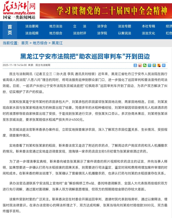 2025年11月11日,《民主与法治网》刊发了《黑龙江宁安市法院把“助农巡回审判车”开到田边》。