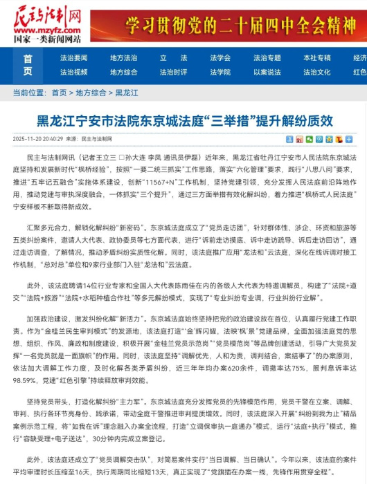 2025年11月20日,《民主与法治网》刊发了《黑龙江宁安市法院东京城法庭“三举措”提升解纷质效》。