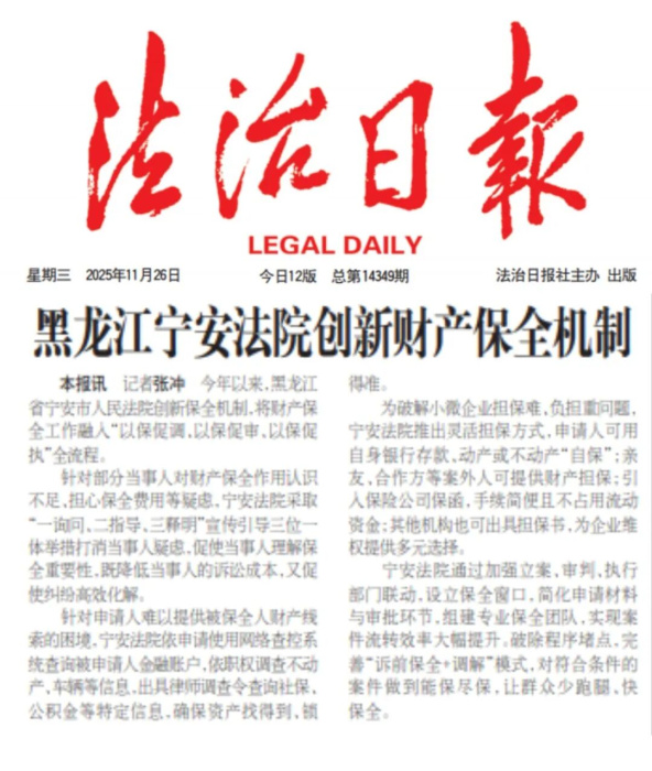 2025年11月26日,《法治日报》刊发了《黑龙江宁安法院创新财产保全机制》,对宁安市人民法院关于财产保全工作的经验做法进行报道。