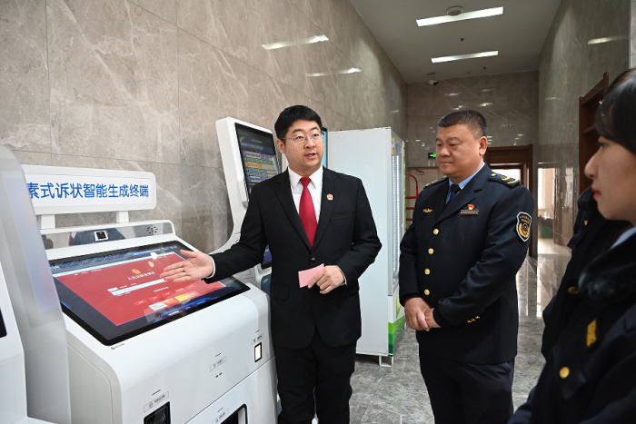 随后,一行人走进诉讼服务中心,实地感受“一站式”司法服务的便民温度。导诉台前,工作人员详细介绍了立案登记、材料收转、法律咨询等全流程服务,并着重介绍了最高院推出的67类要素式“两状”示范文本;设置朝汉双语导诉台,以及针对老年人、残疾人等特殊群体的优先办理、全程陪同服务举措,让大家切实体会到司法为民的细致考量。王启龙局长现场询问了“龙法和”云法庭解纷系统等智慧诉讼平台的应用情况,对法院以科技赋能提升服务效率、降低群众诉累的做法给予充分肯定。