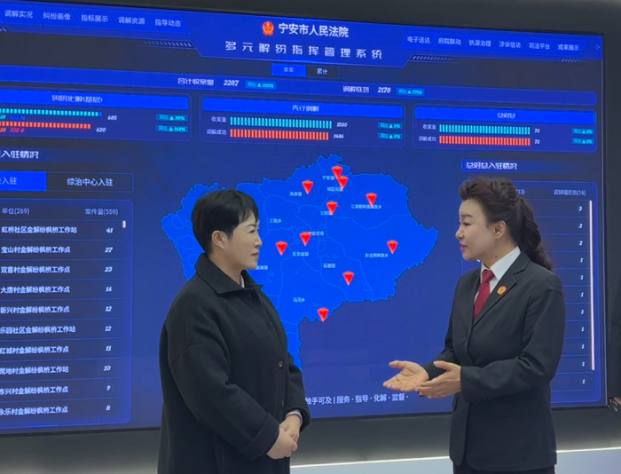 “科技赋能司法,数智高效为民。”调研组一行走进多元解纷指挥中心,实地查看“龙法和”云法庭解纷系统运行情况,重点询问宁安本地纠纷特点及多元解纷工作推进情况,对指挥中心依托大数据精准研判矛盾纠纷演变规律、梳理高频纠纷类型与多发领域的做法给予高度评价。
