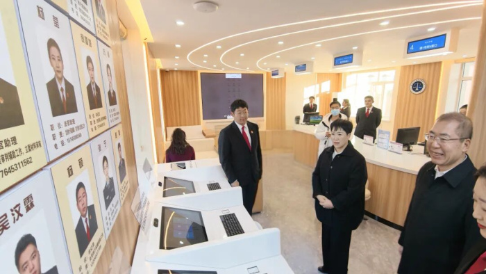 随后,调研组一行在东京城人民法庭,实地察看了法庭诉讼服务中心、科技审判庭、家事审判法庭、正心书屋等场所。在立案窗口,委员们详细询问“一站式”诉讼服务流程,对网上立案、网上缴费、线上调解等便民举措表示赞许。在示范文本推广区,委员们了解“两状”示范文本推广情况,扫描宁安法院自创的“六码合一”文创魔方,使用多功能司法服务终端机检索人民法院案例库和多元解纷案例库入库案例、法答网精选答问,亲身体验一键生成和转化“两状”示范文本及宁安法院自制的调解申请书和答辩意见书;家事法庭内“圆桌审判”的温情设计、母婴室、心理咨询室等疏导机制的引入,让调研组一行深切感受到司法为民的细腻考量,高度赞扬法庭“把‘如我在诉’的意识融入司法服务全过程”的务实作风。