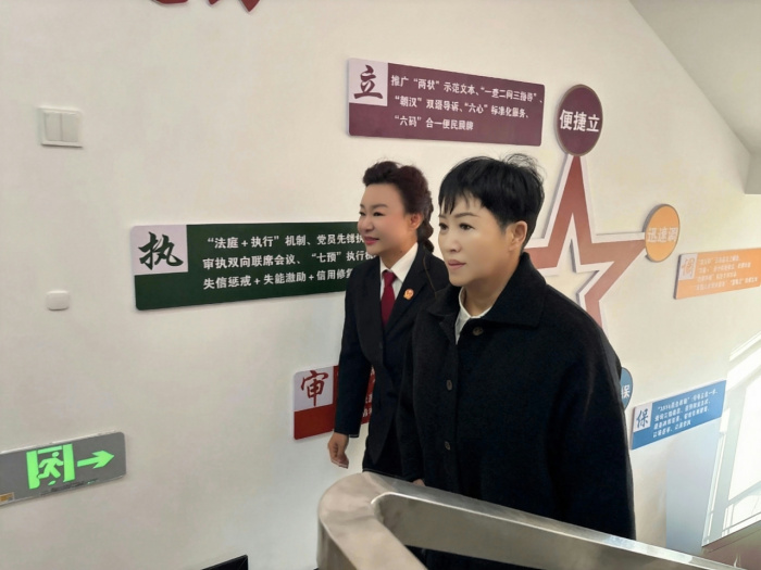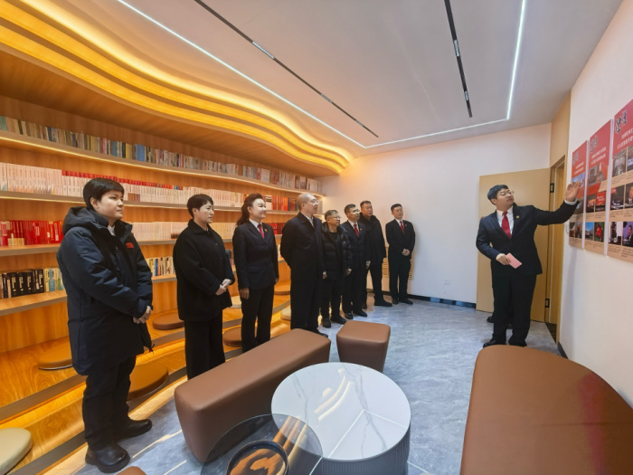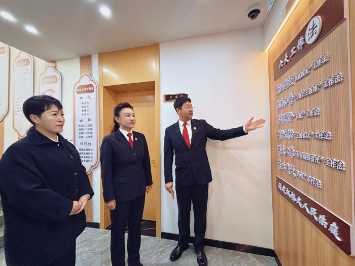 工作人员于法庭走廊的工作图版前,向委员们详细介绍省法院重要工作抓手及法庭实践落实路径——法庭始终以省法院核心工作理念为指引,将“一要二统三抓实”作为工作总思路,以“三争晋先”凝聚奋进动能,以“四化四解四到位”矛盾纠纷预防化解体系筑牢基层解纷根基,以“五牢记五融合”党建与业务融合实施体系强化党建引领,以“六清管理法”规范案件管理,凭“八思八问”践行司法为民,用“十个始终十个做到”锻造过硬队伍,同时锚定枫桥式人民法庭建设目标,推动矛盾化解在基层、服务延伸至群众身边,委员们对法庭“以理念为引、以实践为要”的工作作风及将上级要求落到实处的成效予以肯定。