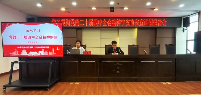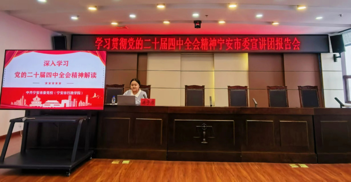 为深入学习贯彻党的二十届四中全会精神,切实把全院干警的思想和行动统一到党中央决策部署上来,12月18日,宁安市委宣讲团成员、市委党校教师赫子怡应邀来到宁安市人民法院开展学习贯彻党的二十届四中全会精神宁安市委宣讲团报告会,法院全体干警参加会议。