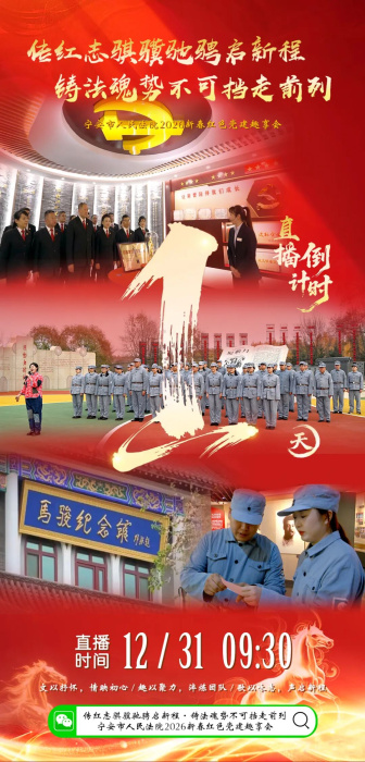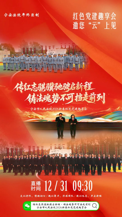 为深入学习贯彻党的二十届四中全会精神,进一步落实“五牢记五融合”实施体系,推动党建与业务深度融合,12月31日,“传红志骐骥驰骋启新程·铸法魂势不可挡走前列—宁安市人民法院2026新春红色党建趣享会”跨年直播重磅上线! 这是2025年的收官之约,更是2026年的开篇序曲,无需奔赴现场,云端解锁多重惊喜!文艺汇演展现司法温度!干警及家属联袂演绎文艺节目,经典曲目轮番登场,每一段表演都映照实干足迹!不止文艺盛宴,趣味互动更添精彩!马骏纪念馆里的红色寻宝、原动力广场上的团结过河与红色接力赛,将党史知识、法院业务巧妙融入游戏关卡,“玩中学、学中悟”间,尽显宁安法院干警“党建强、业务精”的过硬风貌。宁安法院干警将化身文旅推荐官,通过直播镜头带领大家领略牡丹江宁安镜泊湖的秀美风光,深切感受宁安法院以司法之力护航“两山”理论实践的责任担当,让“生态镜泊·法护宁安”品牌形象更加深入人心。从“金桂兰民生审判模式”的继承发扬,到新时代“枫桥经验”的生动实践,2025年宁安法院实干担当、勇挑大梁、走在前列的奋进足迹,都将在这场直播中一一呈现!