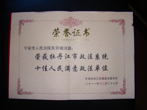 12月28日,在牡丹江市政法系统“三个十佳”评选颁奖晚会上,宁安市人民法院东京城法庭经过层层筛选荣获“十佳人民满意政法单位”荣誉称号。